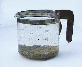 1.沈殿汚泥混合の池水500ccに「アラゴナイトSP+自然凝集剤添加」を小スプーン1杯入れ攪拌。