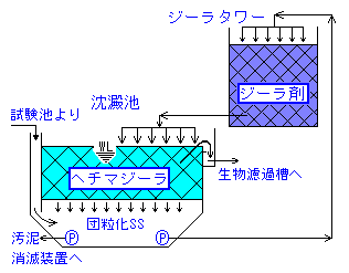 | 注:本図は参考図である。実際は、処理量に合わせた大きなものを作り、処理工程の最終段階で非処理水をジーラタワーで濾過し、希釈用の返送水として再利用する。 |