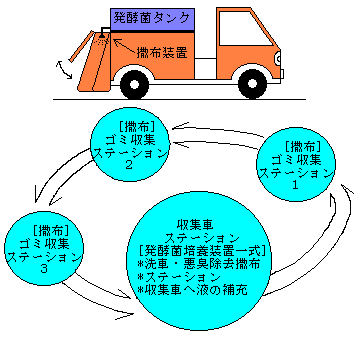 収集車の上部に有用菌タンクを設置し、必要に応じて撒布する。さらに、収集車ステーション内にも