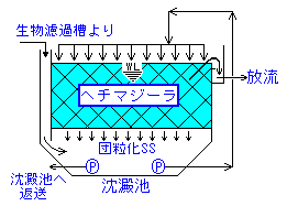 コメント 『ヘチマジーラ』はポリプロピレン繊維で網目状構造なので空隙率が大で、また、表面積も大きいので、SS捕獲・保有能力が大きく、また目詰りしない。この特性を生かして、ヘチマジーラを沈殿槽に設置すると、汚泥やSS、またアオコ等が理想的な形態で収穫できる。 ヘチマジーラに捕獲・吸着したSSは、凝集してブロック化が促進し、剥離すると沈殿しやすい形態になる。 槽上部に設置された散水管によりヘチマジーラに付着したSSは洗い流されて槽底に沈殿する。これにより濾材の取り外し洗浄等の厄介なメンテナンスは不要となる。 槽底に沈殿したSSは返送ポンプにより沈殿池に圧送されて、沈殿池に付設されたジーラタワー内で繁殖する嫌気性菌により 発酵→分解→消滅する。本装置は、以上の工程が自動的に繰返されるメンテナンスフリーのシステムである。 |