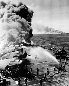 | 火を吹きながらも猛然と突入してくる特攻機、アメリカ兵は死のダイブと呼んで恐れた。(左上) カミカゼの攻撃により、被弾して大火災を起こすアメリカ空母。(左) |