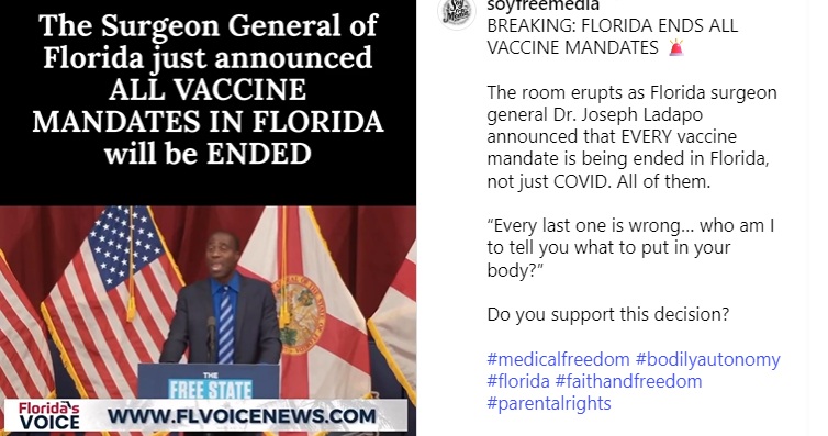 フロリダ州の公衆衛生局長ジョセフ・レダポが、子供を含めてすべてのワクチン強制接種を廃止すると宣言した。