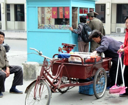 同日昼過ぎに歩いた平壌駅周辺の路地では、「新聞」と書かれた売店に人だかりができていた。「新作」という張り紙があり、CDやDVDが売られている。DVDの再生機を持つ市民も多いようだ。売店の前では、三輪自転車の荷台にトマトやナシを並べる女性がおり、ウリを持った別の女性が合流した。自然発生的な即席の市場だ。トマトは1キロ2800ウォン(闇レートで約200円)。話しかけると「ナシが甘いよ」と薦めてきた。