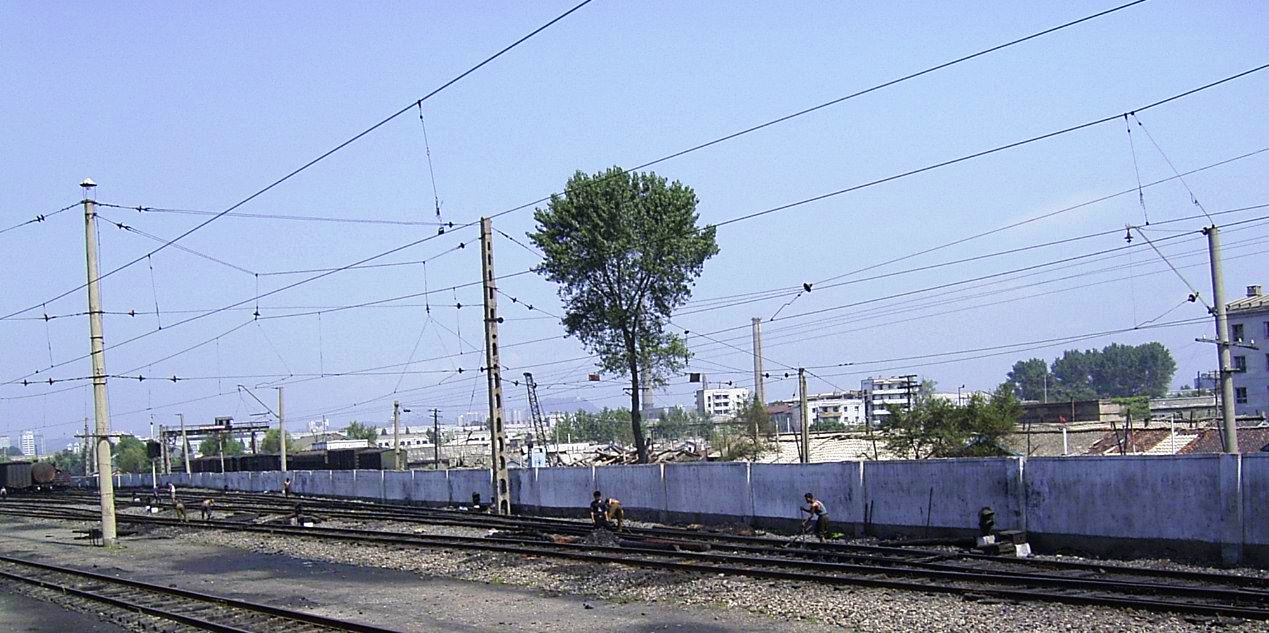 ↑ 新義州駅の構内に鉄道を修理している人たち。