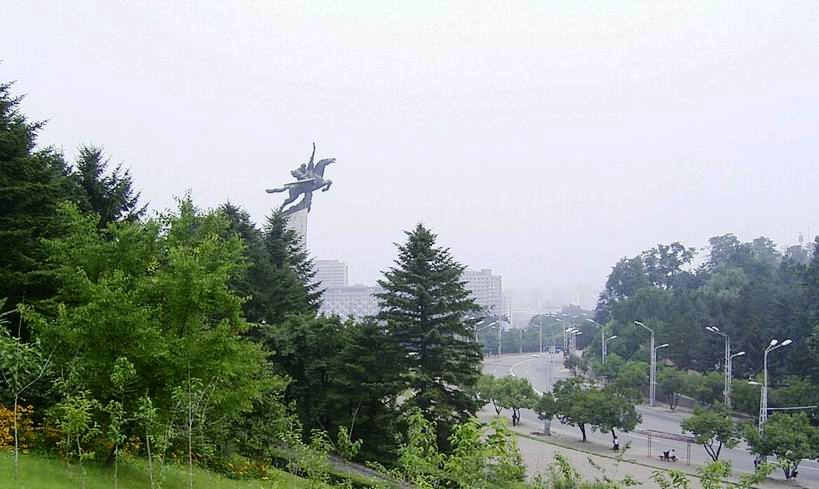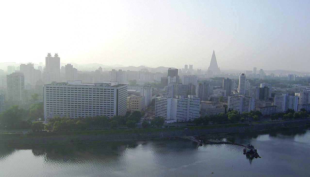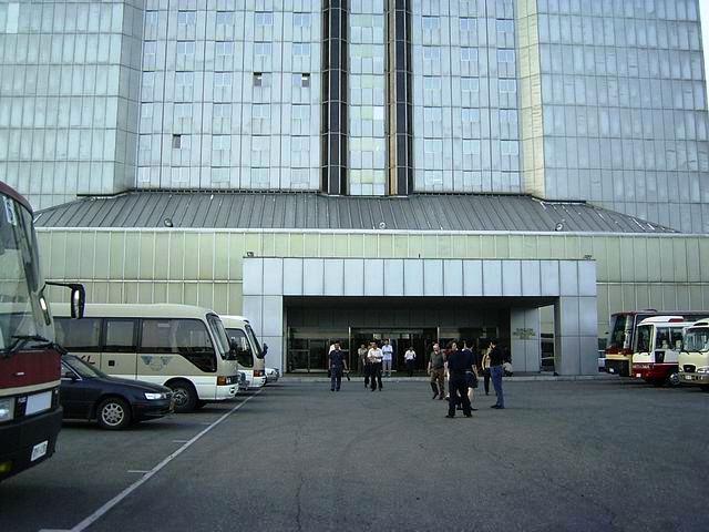 ↑これは、「羊角島国際ホテル」の28階の客室から見下ろした平壤です。この「羊角島国際ホテル」は、名前の通り羊角の形の半島にあります。私たち外国人を外に行かせない為、外への一本しかない道には、朝鮮国家安全局の監視員が立っています。