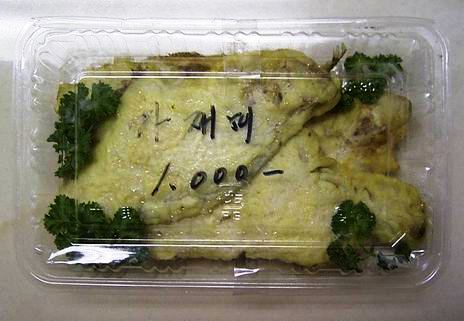 ↑「仁慈館」朝鮮料理の晩飯が終わって、ホテルに帰った後、もう10時半ごろになりました。昼間、7時間、エアコンも無い列車を乗った私は、また一人だけホテルを出て、羊角島を離れ、街灯一つもない平壤を歩きました。真っ黒な道に歩いている人や自転車を乗っている人たちは、皆懐中電灯を使っています。この真っ黒な道を45分ぐらい歩きましたら、平壤駅に辿りました。これは、駅前のお弁当屋さんの一番高級なサカナとタマゴのお弁当です。1000WONです。食パンは、一個50Wonです。多分こんな高級なお弁当を買う人が少ないので、真夜中に表れてきた外国人がピン札の1000WONを渡され、弁当屋のおばさんがびっくりして、またすぐ喜ぶようになる表情の変化は、あまりにも激しいです。