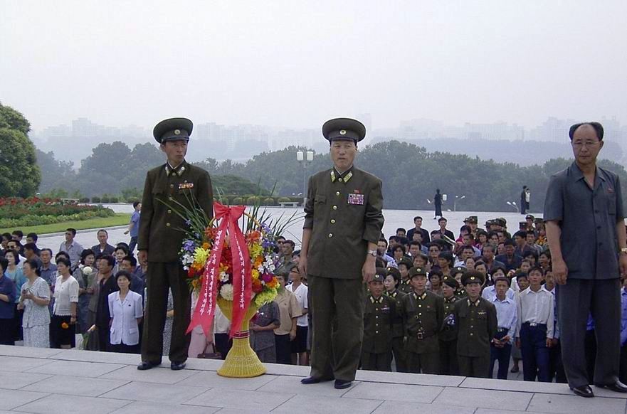 すごい!この老婦兵の胸に勲章いっぱい飾って、金日成銅像に献花に来ます。