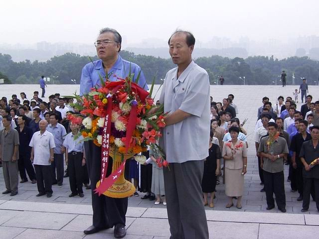 写真右側の緑屋根の建築物は、金日成主席の息子ーー金正日記念館です。作りもお父さんの記念館とそっくりです。中に展示している物も、世界中の人々が金正日委員長に捧げたプレゼントばかりです。ガイドさんは、案内しようとしましたが、私たち中国人の観光客の一部は、お父さんとそっくりだとしましたら、もういいでしょうと愚痴をいって抵抗してきました。