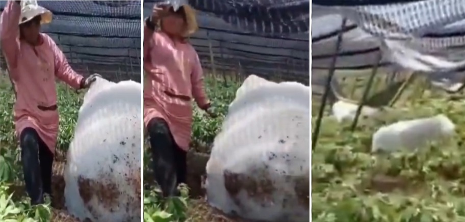 写真は、農家のビニールハウスの屋根を破って、米俵くらいの氷雹が降った様子だが、残念ながら日付と場所が不明だ。
