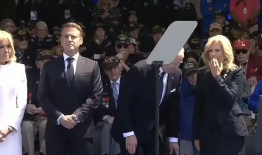 マクロン大統領夫妻の前で、バイデンは急にかがみこむような姿勢になり、隣にいたジル夫人は鼻をつまんだ。