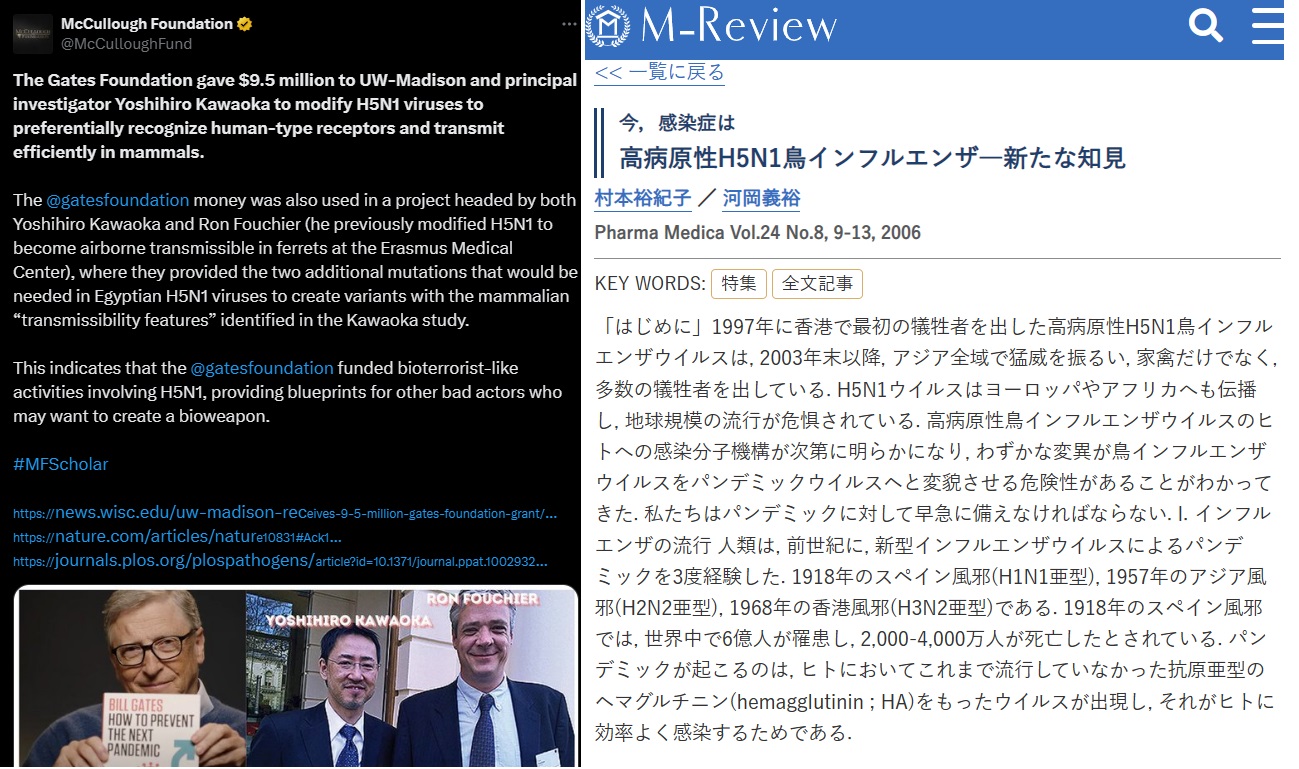 マッカロー博士によれば、ゲイツ財団が950万ドルを寄付して、東大の河岡義裕教授にH5N1を人に感染するよう改造させたという。