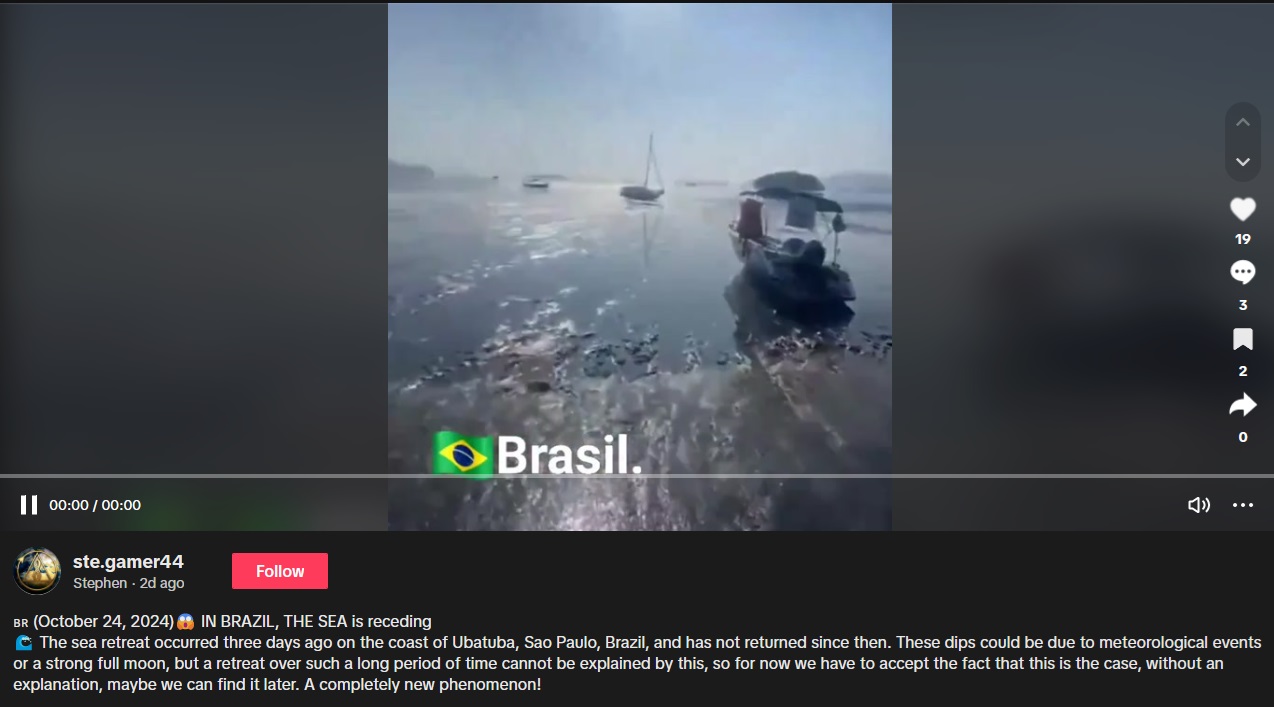 どうも、先週に海水面の異常が見られたのは中国だけではなく、21日ブラジルでは数メートルの退潮が見られたという。