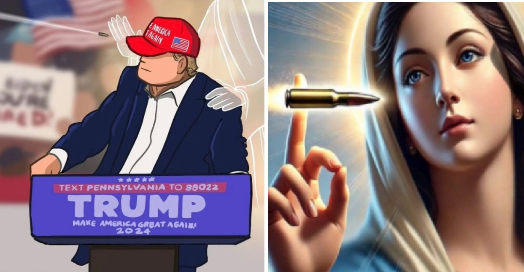 マーティン・ルーサー・キング牧師とケネディの首が、トランプの頭と並んで映る配置になっており、トランプ暗殺を示唆している。