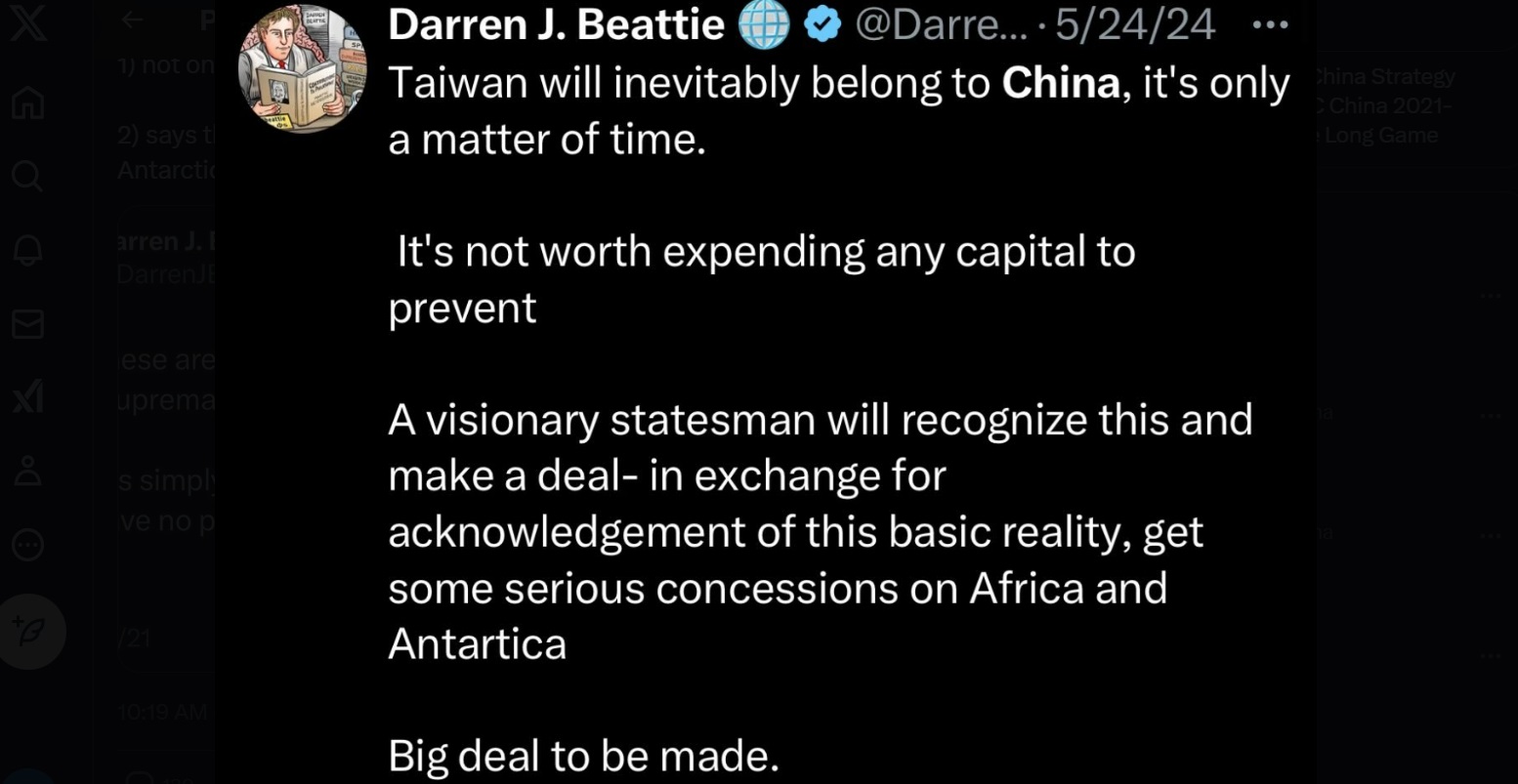 ダレン・ビーティ―は、「台湾が中国に編入されるのは時間の問題で、阻止するために金を出す必要はない」と述べている。
