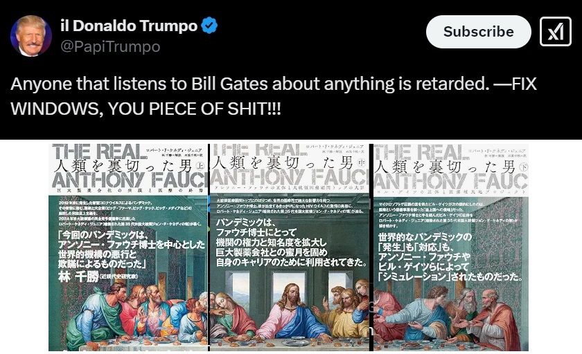 しかし、最近トランプは「ビル・ゲイツのたわごとを聞く奴はバカだ。ウインドウズを修理しろ、このクソ野郎」とツイートした。