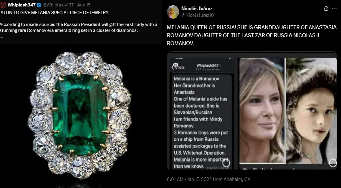 メラニアはロシア革命で一族皆殺しにされたロマノフ家の唯一の生き残り、アナスタシアの子孫との説があるのだ。