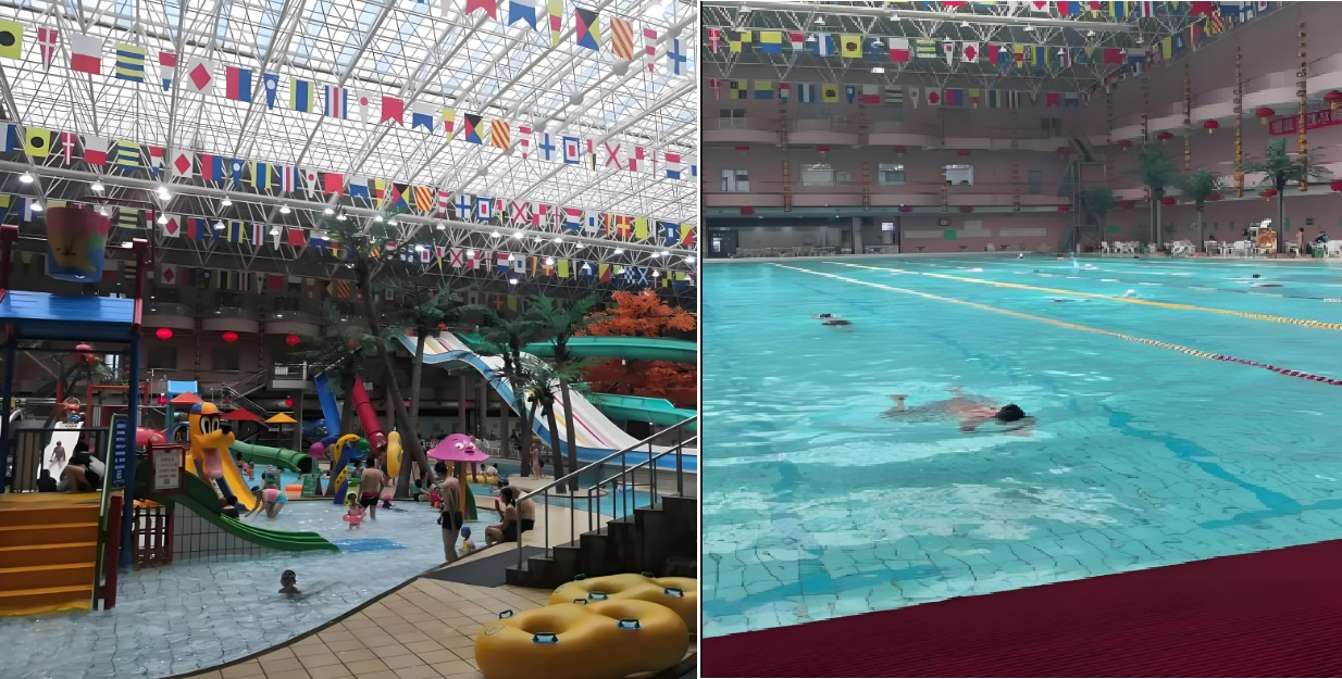 ホテルに隣接した巨大室内プール施設で、本格的な競技用プールと、巨大滑り台がある子供用プールがある。