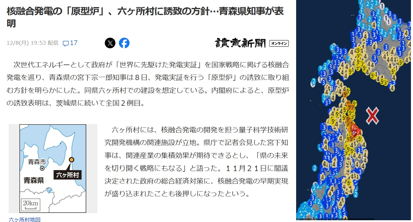 そういえば、青森県知事が核融合炉の誘致を発表した当日に、青森沖で地震が起きたのも、やはり同じような背景なのか。