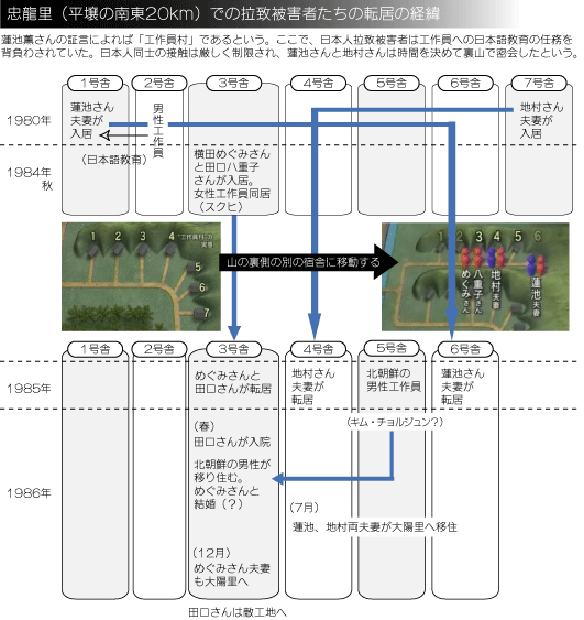 | 1985 | 年末 | チュンリョンリ1地区の日本人拉致被害者は全員が2地区に移動(蓮池薫証言) |