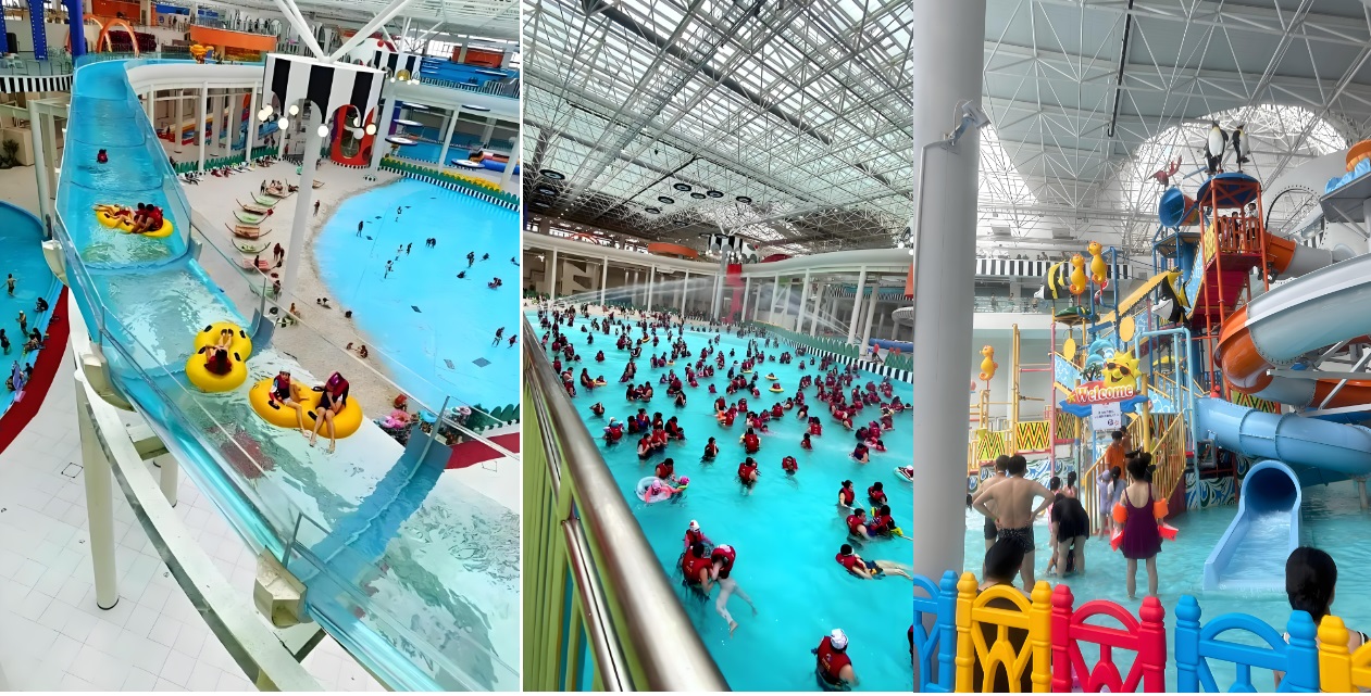 ここは、巨大室内プール施設で、子供が遊ぶ滑り台プールや、人工波が来る室内ビーチ、温泉サウナなどが一体となっている。
