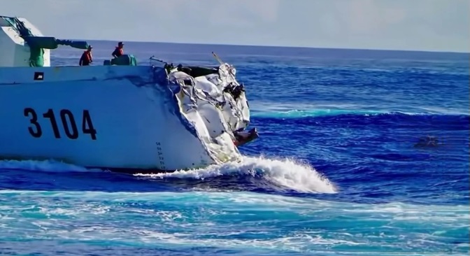 フィリピン船は小型の高速船で、中国海警船と海軍駆逐艦が並走して、小型船を挟むようにして拿捕しようとして衝突した。