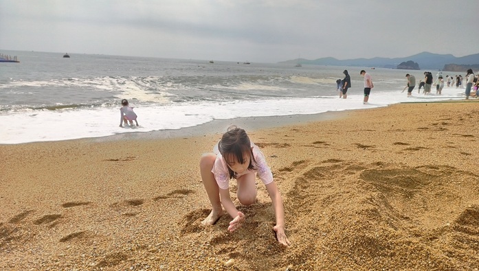 子供は波打ち際で延々と砂遊びをして遊んで、妻は海岸であれこれポーズを取ってはセルフ撮影に興じていた。