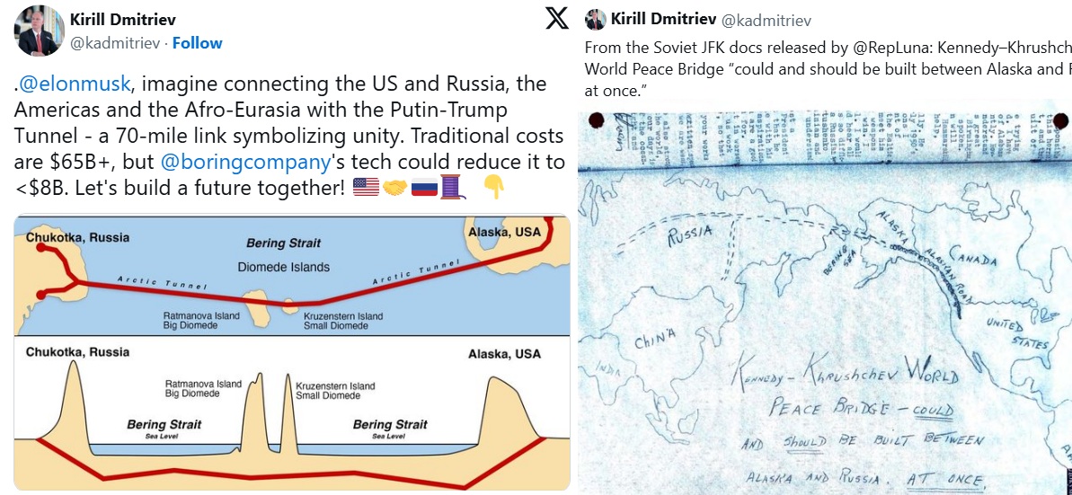 露のドミトリエフ・キリエフが、イーロン・マスクに向けて、アラスカに海底トンネルを建設して、米露間を結ぶ提案をしたのだ。