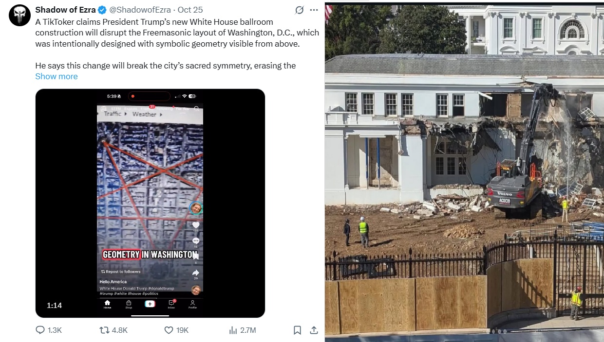 ホワイトハウスの設計は、フリーメーソンによってシンボル化されており、そのシンボルを破壊するためではないかという。