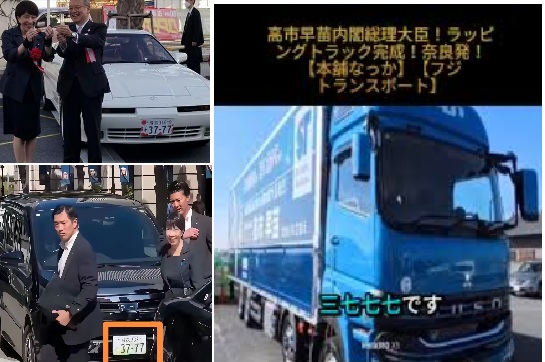 このナンバーは、「サナエラッキーセブン」という意味と、高市の誕生日が3月7日、夫の山本拓誕生日が7月7日から来ている。