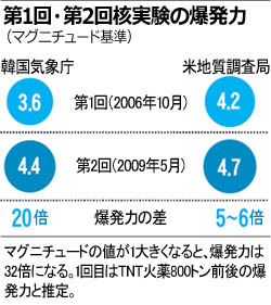 核問題:最大でTNT火薬2万トンの威力3年で北朝鮮の核兵器の性能は改善されたのだろうか、改善されたのならどの程度だろうか。北朝鮮が25日午前、咸鏡北道吉州郡豊渓里で実施したものとみられる核実験の威力について、専門家らは「2006年10月に実施した第1回核実験より、少なくとも5−6倍、多くて20倍ほど強まったようだ」と分析している。 ◆「1回目より5−20倍、爆発力強まる」 気象庁は25日、吉州郡豊渓里でマグニチュード(M)4.4の地震を観測したと発表した。これは06年の第1回核実験当時、気象庁が発表したM3.6に比べ0.8強い。 マグニチュードは地震を起こしたエネルギーの絶対的な大きさを計る数値だ。地震の規模とエネルギーの相関関係によると、マグニチュードの規模が1増えると、地震を起こしたエネルギーは32倍大きくなる。マグニチュードが2増えると32掛ける32倍、0.5増えると32の0.5乗などと、対数関数に従う。気象庁のユ・ヨンギュ事務官は「今回のマグニチュードが1回目のときより規模が0.8強かったため、地震を起こしたエネルギー、つまり爆発力は1回目に比べ20倍ほどになる」と述べた。 しかし、これは米国政府の観測値とは大きな差が出ている。米地質調査局は06年の第1回核実験当時にはM4.2を、今回の第2次核実験はM4.7を観測値として示した。従って、この資料によると、地震の規模は0.5強まり、爆発力は5.6倍ほど強まったことを意味する。1回目と比較して、今回の核実験の威力が強まったのは確かだが、その威力の増加程度が韓国の観測値より低いということだ。 核兵器の専門家らは、旧ソ連の核実験から発生した地震波と後に公開された核兵器爆発力を基に、M4のときはTNT火薬1000トン前後相当が爆発したものとしている。米国側の観測値によると、今回の第2回核実験の爆発力はTNT5000−6000トンになり、韓国気象庁の観測値によると2万トンほどになる。 吉州郡で発生した地震波は大半が東海(日本海)を経て韓国の地震観測所で探知されるが、この地震波が韓半島の陸地とは構造が違う東海の地殻を伝わってくる過程で、地震波が弱まるというわけだ。気象庁の地震規模観測値が、第1回、第2回とも米地質調査局の数値より低いのはそのためだ。 第1回、第2回核実験が同じ条件で実施されたのかは分からないため、単純に比較はできないという指摘も出ている。ソウル大学原子核工学科の李銀哲(イ・ウンチョル)教授は、「核実験を実施した地下坑道の幅、長さといった構造と、地質の性格、そして岩盤構造などによって測定強度が変わることもある。1回目の実験のときと完全に同じ条件で今回の実験が実施されたなら、威力が強まったといえるが、今回も前回と同じ条件で実験したかは疑問だ」と話した。 ◆放射性物質の探知で最終確認可能 気象庁の関係者は「今回の地震が核実験によるものと推定される人工地震だという事実は、二つの面ですでに確認された状態だ」と話す。まず、人工地震と自然地震の違いは、地震波の波長で見分けることができる。自然地震は規模が大きいほど、断層が長い時間にわたって長く割れることで、地震波は低周波になる。一方、核実験による人工地震は、核爆弾が一瞬で破裂して発生するため、地震波が高周波になる。「同規模の地震でも高周波なら人工地震と判断できるし、核実験かどうかは地震波の分析だけでも確認可能だ」と専門家らは話す。気象庁は「済州島を除いた全国100カ所に設置された地震波観測所すべてで、人工地震であることを知らせる(高周波)波動が観測された」と話した。 人工地震と自然地震を見分けるもう一つの要素は、空中を行き来する音、つまり音波の観測だ。気象庁のユ・ヨンギュ事務官は「自然地震とは違い、核実験では音波が観測されるが、(今回の核実験当時)全国5カ所にある音波観測所のうち2カ所で音波が観測された」と述べた。最終確認は放射性物質の検出によって行われる。核爆弾を爆発させる実験を行ったなら、ウラニウムやプルトニウムが壊れ放射性物質が発生する。核実験は放射性物質の流出を防ぐため、普通地下1キロの地点で実施されるが、北朝鮮は山に横方向から斜めに坑道を掘る方式を選んだものと分析されている。山の高さのおかげで地下に掘り進めたのと同等の効果を得られるためだ。 パク・ウンホ記者 李永完(イ・ヨンワン)記者 朝鮮日報 2009/05/26 09:00:40